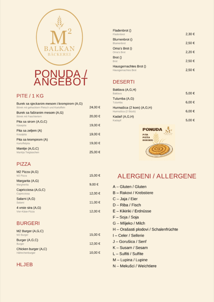 EU-HinweisUnsere Backwaren, Sandwiches und Balkan-Spezialitäten (Börek, Pite, Kuchen und weitere Speisen) können Zutaten enthalten, die Allergien oder Unverträglichkeiten auslösen – z.B. Gluten, Milch, Eier, Nüsse, Sesam oder Soja.